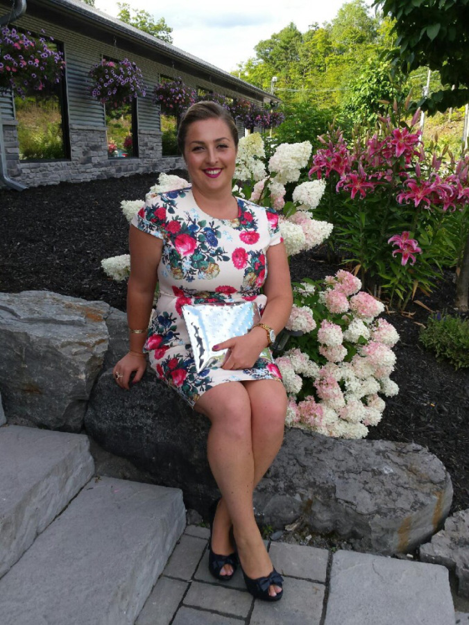 The floral details are crisp and bright. They hit the nail on this one. The bright colours and the cut of the dress are absolutely flattering on any skin tone. The pleated front of the skirt, including shallow pockets, offers a nice distraction and helps to hide my “post-pregnancy” pooch. The caps on the sleeves add a lovey structured but feminine touch. The skirt hits me just above the knee, which is the optimal spot on my legs, and helps to make me look tall and slender.