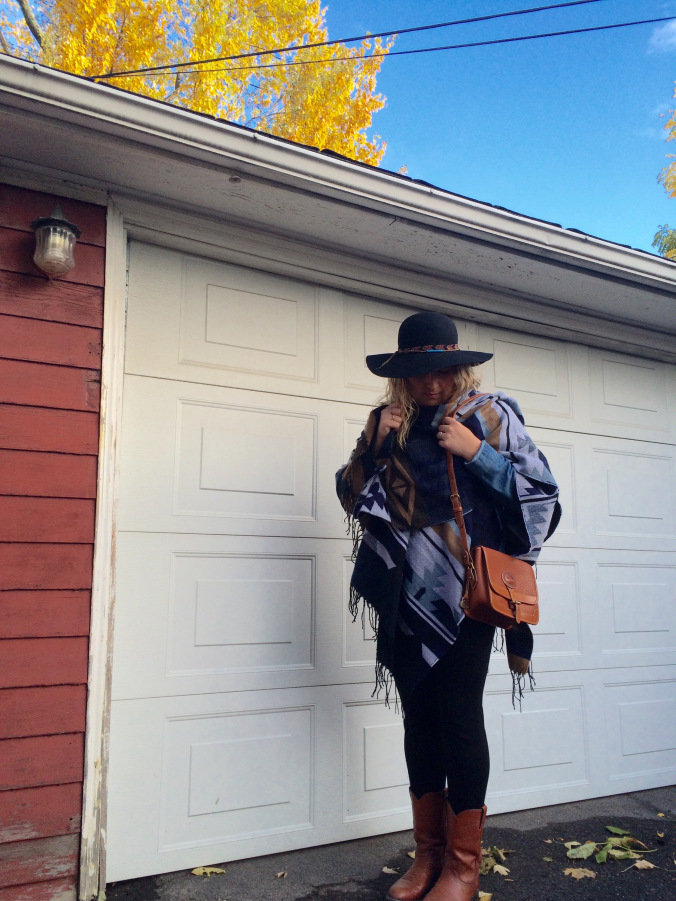 It got really cold this weekend! But I was sort of happy to be able to wear the new Reitmans Poncho I just bought! It’s so cozy and warm, and the colours are perfect! I mixed up my look with some vintage finds: my Dooney and Bourke caramel cross-body satchel and my Justin boots in caramel to match. My hair was still wet from my shower, so a warm wool floppy hat (Lovely Bird), can do just the right trick!