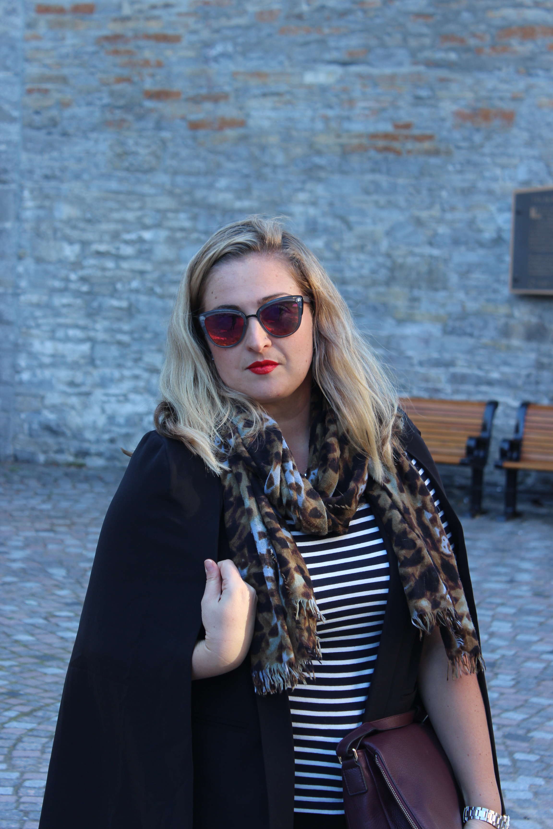 My look today was very Parisian, oui merci! Stripe shirt, black loafers, cigaret pants and blazer. I threw on my leopard scarf for a bit of extra warmth this morning too. My funky Quay sunnies from Simons, some bright red lipstick (Laura Mercier) from Nordstrom, and my Marsala Danier bag complete this look, if I do say so myself.